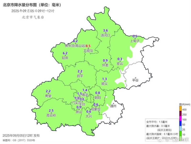 北京新闻(Wang Jin King Reporter)今天是中雨(9月5日),雨水平坦。城市地区的主要降雨时期是从中午到下午的,预计在晚上会消失。在雨天,道路很滑,可见度很差。外出时,您必须知道雨水和旅行安全的保护。雨水影响了整个城市。根据北京天气办公室的数据,从今天的12:00开始,该市的平均降雨量为1.5毫米,平均城市面积为1.2毫米。最大降水发生在8.5毫米的Yankers王子中。预计降雨将持续接下来的两个小时,而且雨水通常保持稳定。北京的降水分布图。北京气象办公室提供的照片是由于雨水造成的,今天的白天昼夜最大为27°C。调整您的牙科晾衣绳的时间限制,请注意不要感冒。周末的阳光主要是阳光明媚,机智h增强温度,使得旅行适合。中午左右,请小心。下周,北京将主要由空气流到西部的大海拔,低水平和高水平覆盖着越来越潮湿的云。目前,这是夏季和秋季的另一种季节。白天和夜晚之间的温度差异逐渐增加。我的身体在早晨和下午感到寒冷。在时间限制内调整衣服,并小心感冒。北京的气象趋势。北京气象局气象办公室提供的照片提醒我们,今天北京的城市有雨。当它出来时,它将被雨水团队覆盖,注意保护雨和Ltravel的安全。由于下雨,一个下午到晚上的温度大大降低。及时添加衣服以避免感冒。编辑Bai Shuang发出王新